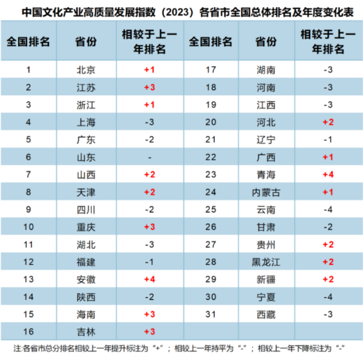 继2021年之后,北京再次荣登全国文化产业高质量发展的榜首;江苏与浙江得分几乎相同,两省并列TOP2。