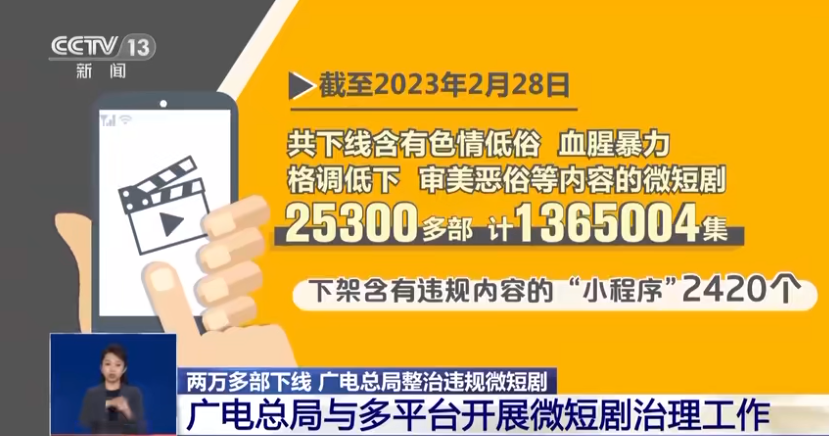 截至2023年2月28日,共下线含有色情低俗、血腥暴力、格调低下、审美恶俗等内容的微短剧25300多部、1365004集,下架含有违规内容的小程序2420个,形成了震慑效应,有力遏制了网络微短剧野蛮生长的态势。
