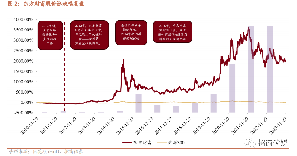 东方财富通过金融数据和广告服务起家,1)东方财富网和天天基金网通过提供海量免费财经资讯和数据吸引投资者或潜在投资者成为用户,是核心流量入口,股吧为用户提供交流和社交需求,也可通过用户对个股的搜索进行引流。2)2012年东方财富旗下天天基金获得第三方基金销售牌照,成为证监会批准的首批独立基金销售机构,2015年国内第三方基金代销机构成为基金代销的主力,东方财富旗下天天基金交易平台代销基金数量与基金资产居于全部代销机构首位,叠加A股市场行情火爆,基金销售业务进入新的爆发阶段,驱动公司基金电商业务实现新一轮高速增长,公司业绩与估值不断攀升。3)2015年公司收购西藏同信,更名为东方财富,成为国内第一家获得经营牌照的互联网公司,此后业务的营收占比迅速上升至 60%左右,成为公司营收主要驱动力。